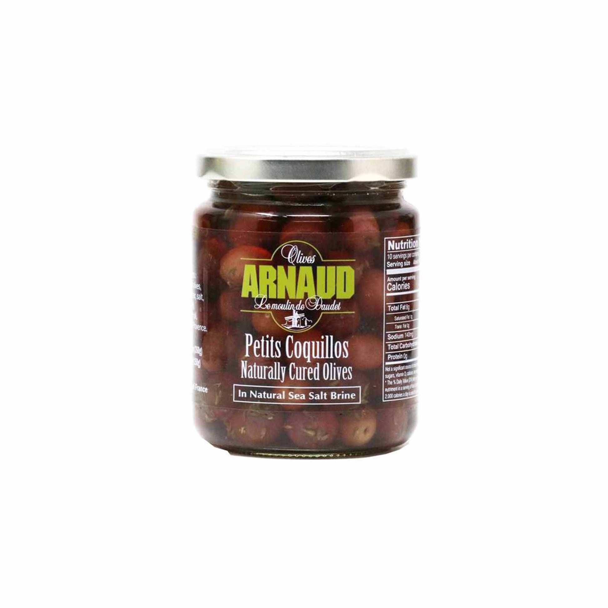 Arnaud Nicoise olives are cured in sea salt for months, leaving a fruity flavor. A three-generation French family has been selling traditional Provencal olives for 50 years. These delicious black olives are prepared with natural sea salt for an authentic French taste. Add them to salads or combine them with tomatoes, garlic, and anchovies for a more Nicoise dish.