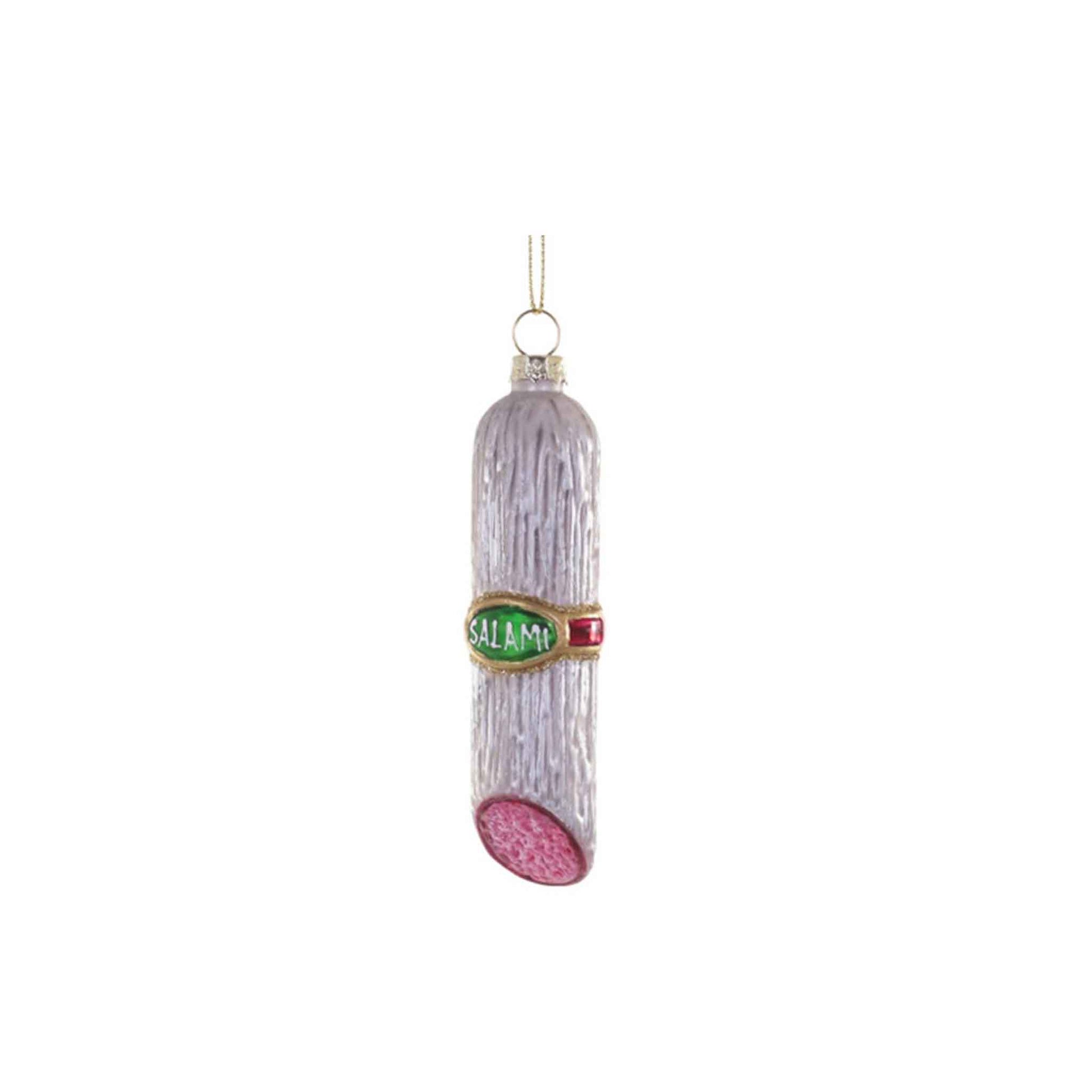 Add a touch of humor and gourmet flair to your holiday tree with the Salami ornament. Made of glass with detailed craftsmanship, this quirky piece is perfect for food lovers or anyone who enjoys a playful festive touch. A fun and unique addition to any ornament collection.