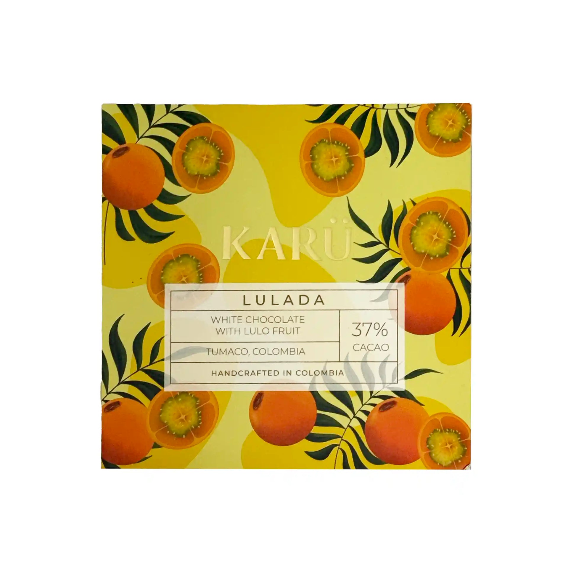 Karu Lulada White Chocolate with Lulo Fruit is inspired by Colombia’s beloved lulada drink, pairing smooth, creamy white chocolate with the bright, tangy notes of tropical lulo fruit. Bold, refreshing, and unexpected, this bar delivers a lively balance of sweetness and citrusy zip in every bite.