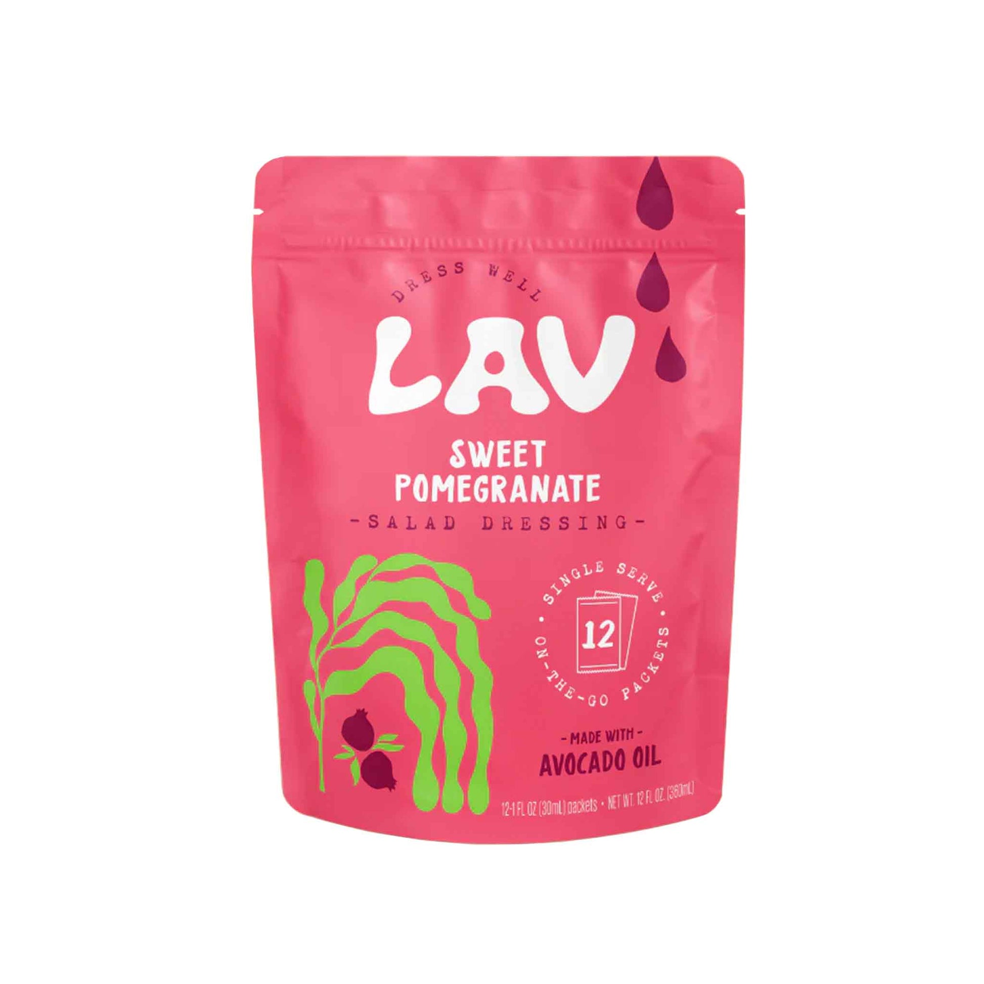 Water, Pomegranate Juice (water, pomegranate concentrate), Avocado Oil, Dijon Mustard Powder (distilled vinegar, water, mustard seed, salt, white wine, citric acid, turmeric, spices), Distilled Vinegar (diluted with water to 20% acidity), Olive Oil, Monk Fruit Concentrate, Dextrose, Ginger Powder, Citric Acid, Garlic Powder, Salt, Black Pepper, Pomegranate Flavor, Dried Mint, and Xanthan Gum.
