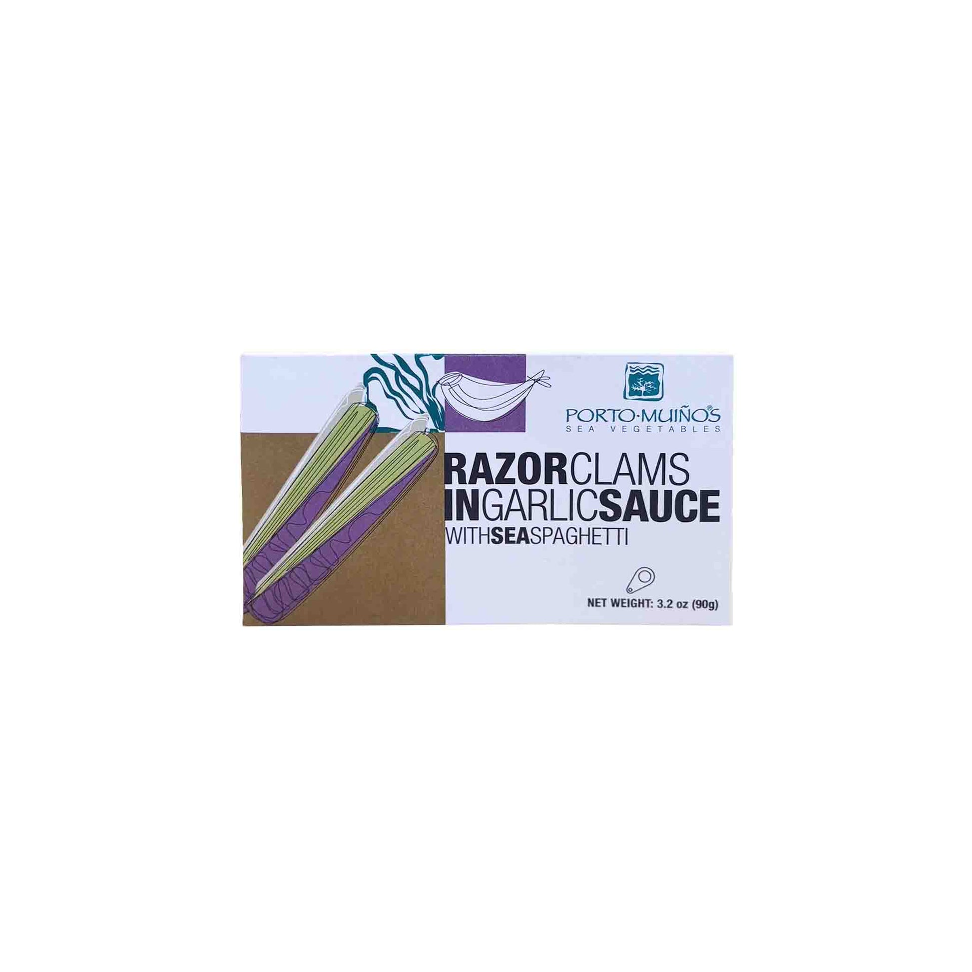 Porto Muinos Razor Clams in Garlic Sauce with Sea Spaghetti offer a delicious fusion of land and sea. Tender razor clams are simmered in a savory garlic sauce and paired with sea spaghetti seaweed, creating a unique and flavorful gourmet experience.