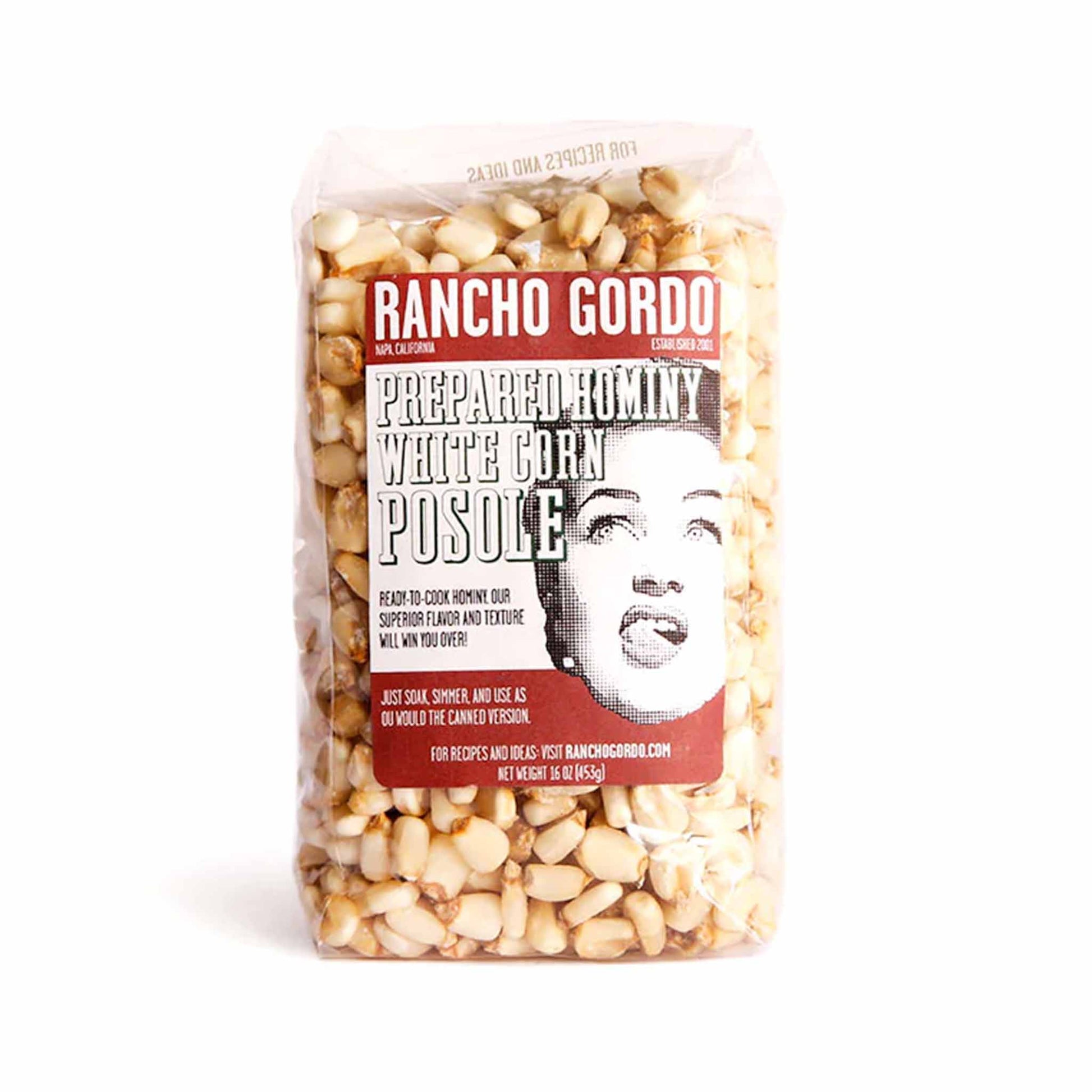 Rancho Gordo's dried hominy is made from heirloom corn, which is soaked in mineral lime to remove its skin and increase its nutritional content.