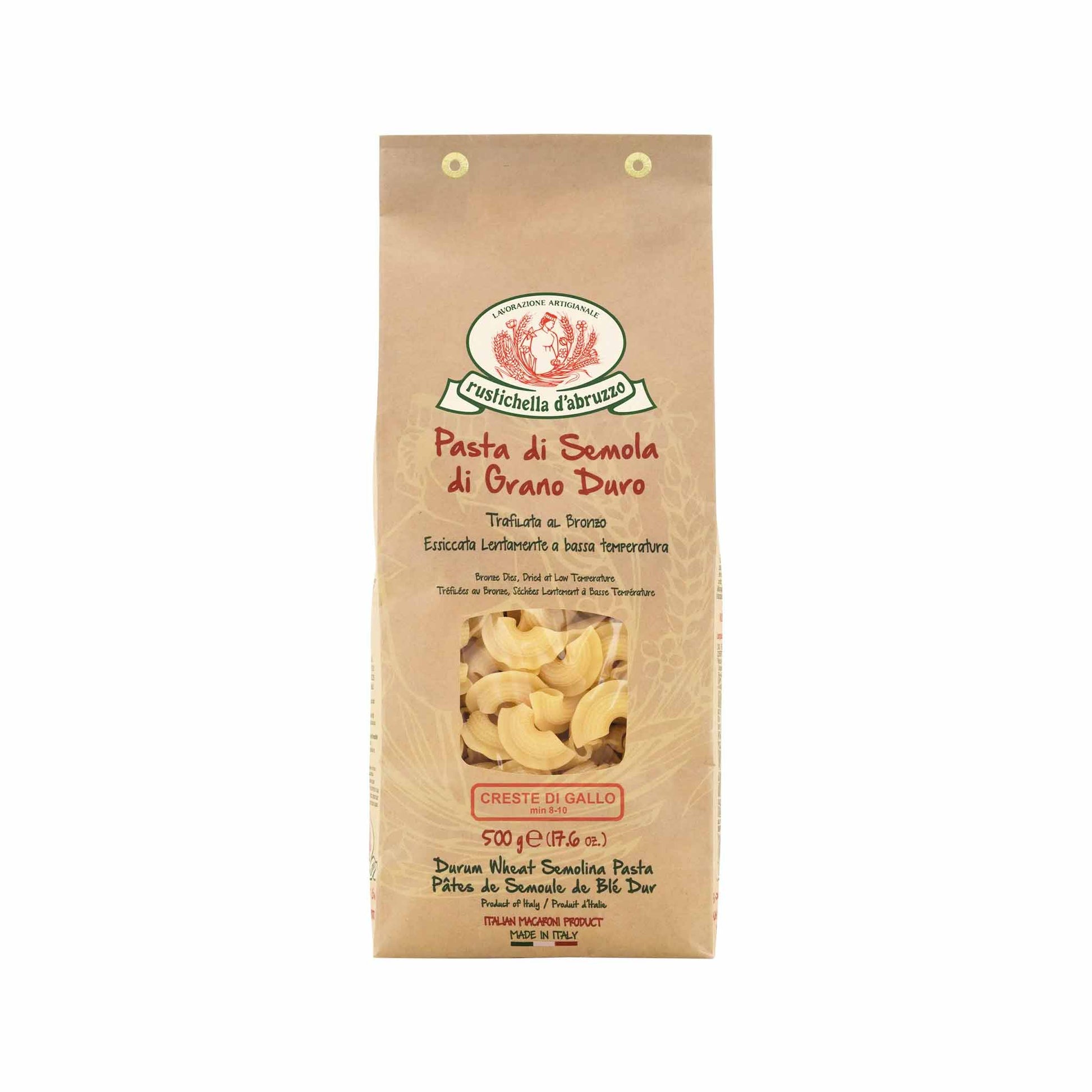 Rustichella d’Abruzzo’sCreste di Gallo is a short, crescent‑shaped pasta—its name meaning “rooster’s crest”—crafted using traditional bronze‑die extrusion and slow, low‑temperature drying to achieve an irresistibly rough, porous texture that expertly captures sauces. Sourced from durum wheat semolina and water, it cooks to an al dente bite and delivers authentic flavor and firm texture, thanks to its artisanal production in the heart of Abruzzo.